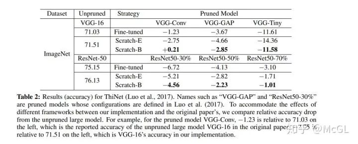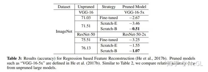 下表显示了基于回归的特征重建所得到的结果。 该方法通过最小化下一层feature map 的重建误差来剪掉channels。 这个最佳化问题是通过 LASSO 回归解决的。