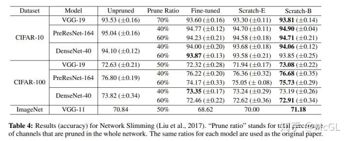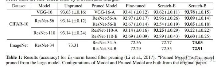 本论文提出的网络剪枝方法分为两大类。 目标剪枝模型的结构由人或剪枝算法决定。 在实验中,作者还比较了预定义和自动方法下,from scratch训练剪枝模型和从继承的权重finetune的结果。
