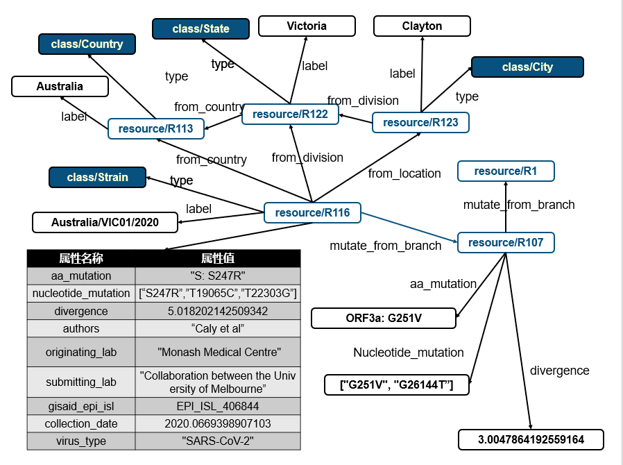 如图所示,图中有Strain毒株,Branch分支,Country国家,State区域和City城市这些实体类型,其中地理位置与Strain毒株的连接通过from_country, from_division和from_location来标识。Country,State,City互相连接构成网络。