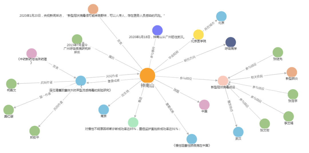 图谱以新冠病毒专家为核心延展至履历、成果、事件、战役等各类概念,形成新冠英雄知识图谱,可基于图谱进行英雄人物动态展示。