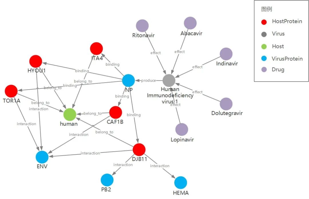 如下图可视化展示,effect 关系用于表示抗病毒药物对于病毒有一定效果,例如Nelfinavir 和 Abacavir 对Human immunodeficiency virus 1有抗病毒效果,通过本关系可查看抗病毒药物和对应病毒间的联系;