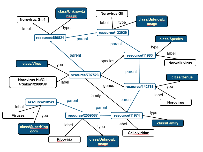 parent关系用于连接Resource之间的层级关系,比如COVID-19病毒在其家族树种的上层结点是unclassified Betacoronavirus。通过parent关系可向上遍历家族树。