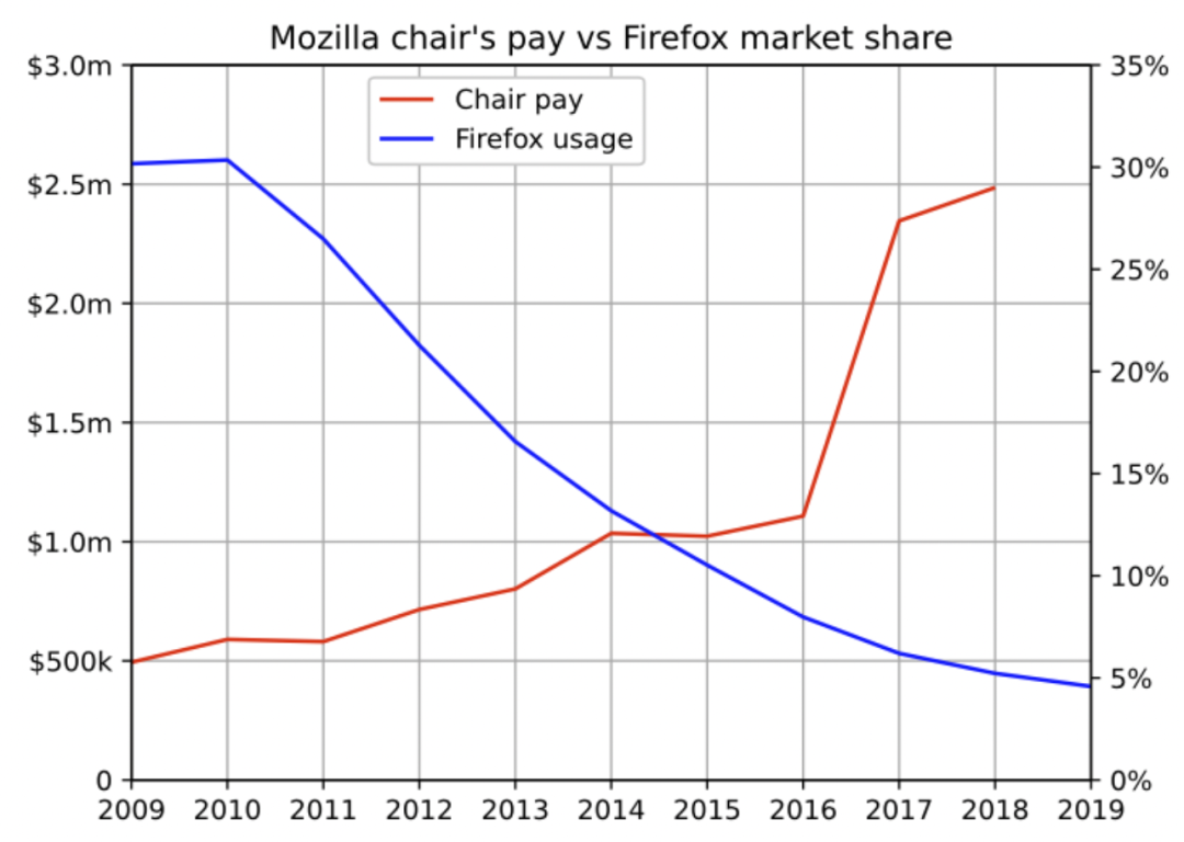 图:Firefox主席要求的薪水与每年损失的用户数量之比