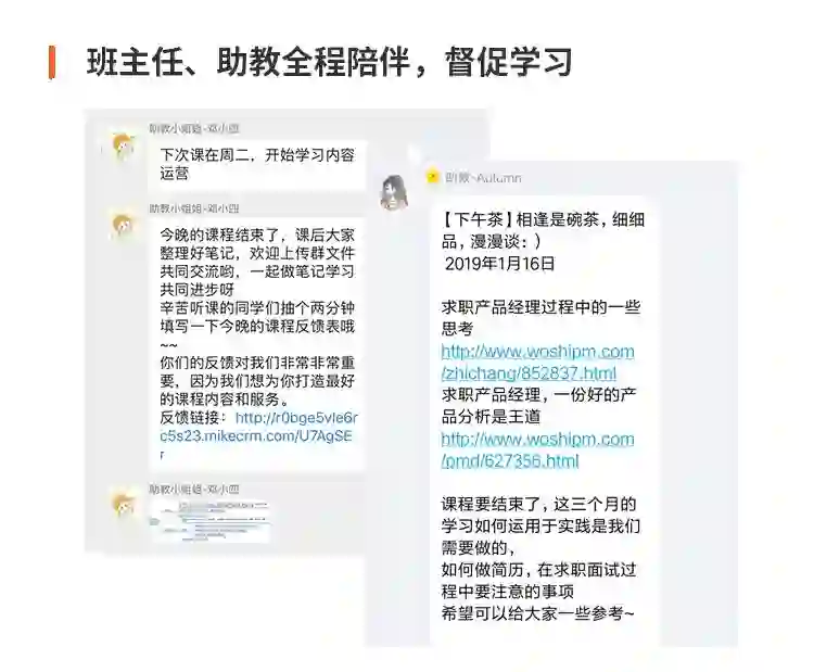 线上课程大家最担心的就是自己的意志力,不能很好的坚持下来整个的学习周期,对此,除了5位授课导师,我们又额外配置了2位专职班主任+1-2位助教(选自往届班级的优秀学员)