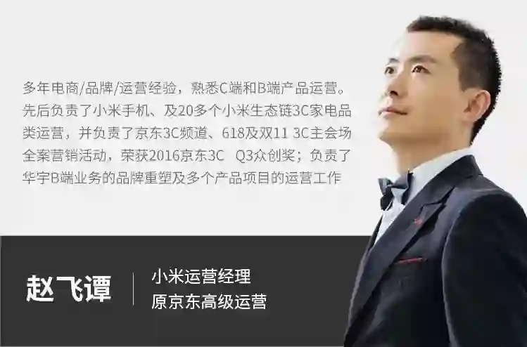 赵飞谭老师,小米运营经理,曾负责京东3C频道、618&双十一3C主会场的全案营销活动,在小米期间负责小米手机及20多个3C家店品类运营,对活动运营、品牌重塑等方面具有独到见解
