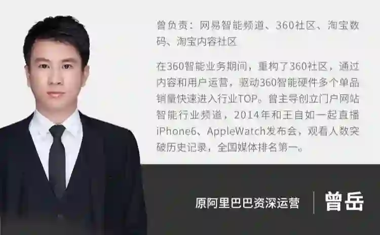 曾岳老师,原阿里资深运营,曾主导创立门户网站网易智能频道、重构了360社区、负责淘宝数码、内容社区等业务。擅长内容运营、用户运营等方向,在媒体及社区产品等领域具有优势