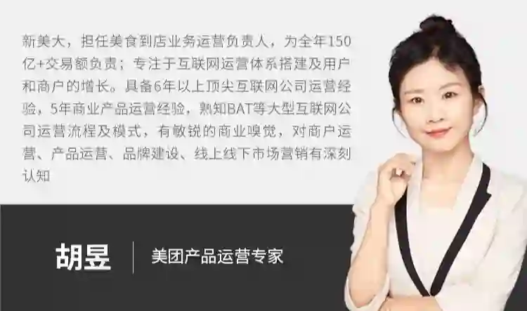 胡昱老师,美食到店业务的运营负责人,专注于运营体系的搭建及用户增长环节,树脂大型互联网公司的运营流程及模式。对B端运营、产品运营、品牌建设、线上线下市场营销有深刻的认知