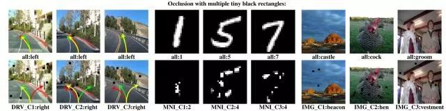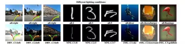 第一个约束模拟不同照明条件下的效果:DeepXplore可以使图像变暗或变亮,但不能改变内容。 在下图中,上面一行显示的是原始种子输入,下面一行显示的是 DeepXplore发现的差异诱导测试输入。箭头指向表示自动驾驶汽车决定转向的方式。