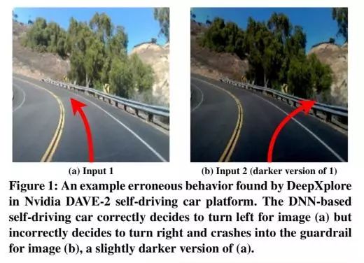 (图 1:DeepXplore在 Nvidia DAVE-2自动驾驶平台上找到的一个错误行为案例。基于 DNN的自动驾驶的车辆在图 (a)的场景中正确地决定向左转,但是在 (b)背景稍暗的场景中却错误地决定右转撞到防护栏上。)