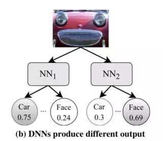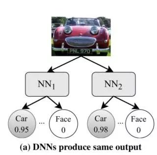 考虑一个简化后的例子,两个深度神经网络用于将图像分类为汽车或者人脸。最开始我们可能会遇到这样的情况,即两个网络均把给定的图像以高概率归类为汽车: