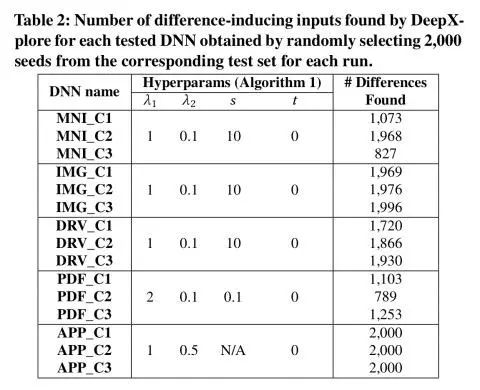 DeepXplore在所有测试的 DNN中发现了数千的错误行为。表 2(如下)总结了在用对应测试集中随机选取的 2000个种子输入(seed input)对 DNN进行测试时,DeepXplore在每个测试的 DNN中发现的错误行为的数量。