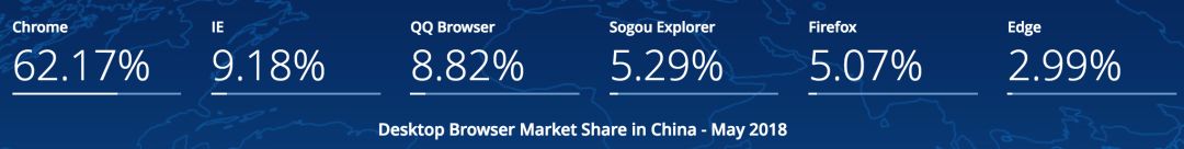 该监测机构还分别对部分国家的数据进行了统计。中国的桌面浏览器市场依然被 Chrome 统治,然后是 IE ,以及相对具有本土特色的 QQ 浏览器和搜狗浏览器。Firefox 以 5.07% 的成绩位居第五名,相比四月份下降了 0.66 个百分点。