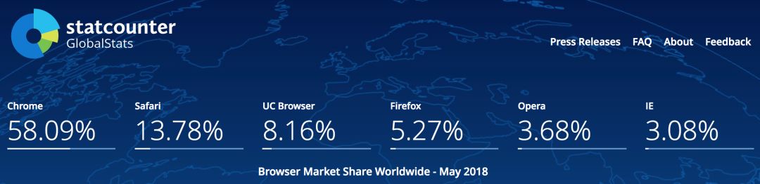 网站通讯流量监测机构 StatCounter 已公布 5 月各浏览器的市场份额,Chrome 以 58.09% 的比例稳居全球全平台第一,Safari 和 UC 浏览器分别以 13.78% 和 8.16% 的成绩拿下第二和第三名,再之后是 5.27% 的 Firefox 和 3.68% 的 Opera 。
