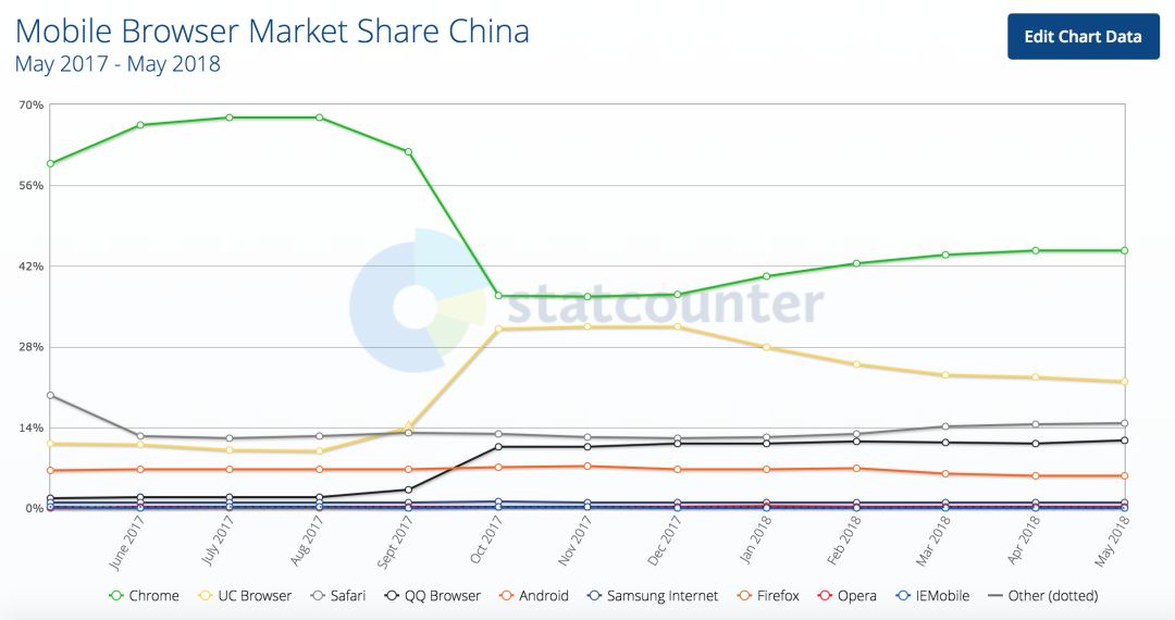 至于国内的移动端浏览器市场,UC 浏览器以 22.06% 击败 Safari 。Firefox 因份额太低,未计入统计。