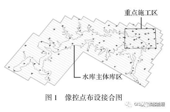 前坪水库主体库区控制校核线呈不规则带状,以河道贯穿中线的地形特征,本文采用“内部沿河 道中线布设、外围边角控制”均匀布点方案,共布设像控点位40个,检查点6个;重点施工区形状为矩 形区域,采用四角两边法区域网布点,布设控制点位19个,检查点6个。布设的控制点如图1所示。