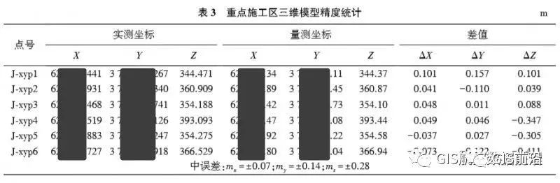 三维建模精度是通过量测模型上检查点的三维坐标与外业实测值进行比对,并作为检测指标。经实际检测,水库主体库区三维粗模平面中误差为 ±0.5~1.0m,高程误差为±1.0~2.0m。重点施工区 倾斜摄影三维精模检测点分布如图3所示,精度统 计情况见表3。