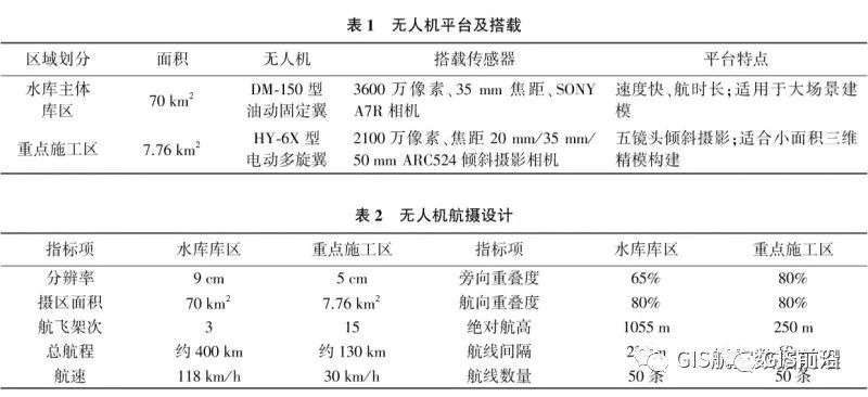 根据前坪水库建设工程对三维模型精度需求划分不同的作业区域,主体库区建立实景三维粗模,局部大坝及附属设施等重点施工区建立实景三维精模。由于库区地处豫西伏牛山区,地形较为复杂适合采用无人机航空摄影测量方法进行数据获取和三维建模。本文选用长航时固定翼油动无人机和电动 六旋翼倾斜摄影无人机作为空间数据获取平台,采用联合作业建模的工作模式。无人机平台及搭载见 表1。