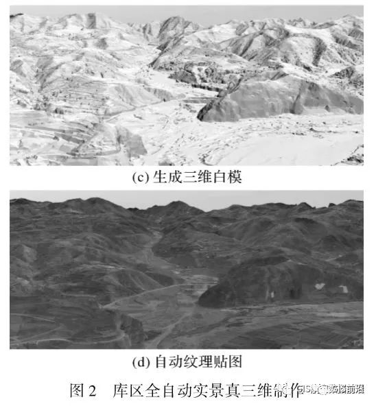 由图2可知,通过对库区高重叠度影像进行处理,获取大量连点,并在此基础上建立精细TIN模型及三维白模,采用映射的方式将高清影像纹理映射到三维白模表面,最终实现实景三维的自动产。