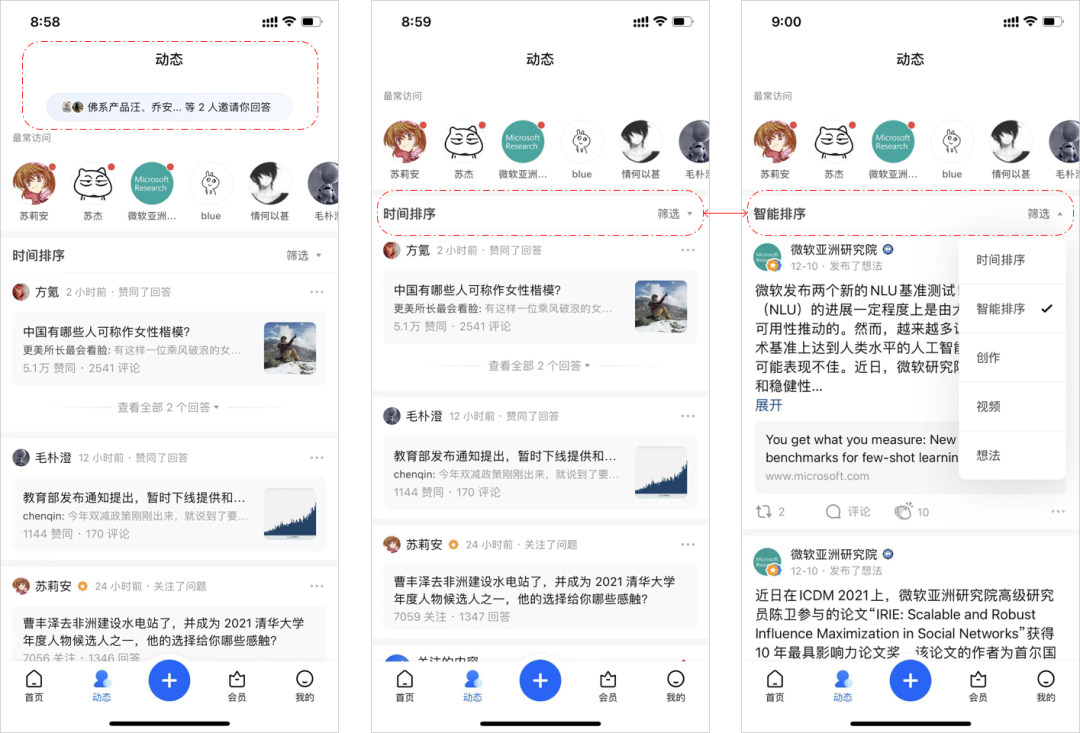 知乎8.0版本将底部原“关注”按钮升级为“动态”按钮,在页面顶部提供了问题受邀等信息的提醒露出,并增加了对关注用户的实时动态追踪,提供多种内容筛选排序服务,如图5所示。