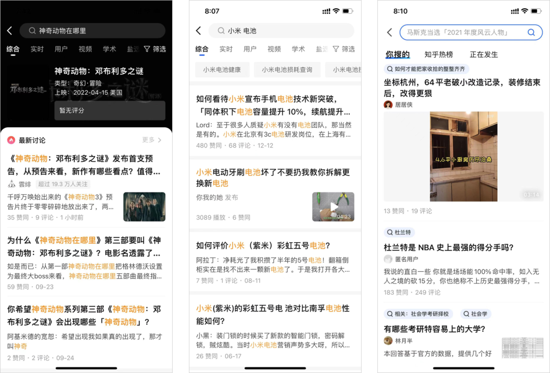 在搜索的后半程,知乎的搜索算法对用户来讲是黑盒操作,通过搜索结果也可以反推出一些基本逻辑,比如当下知乎对视频类内容的推介力度远超以往,从而在搜索匹配时,对相关视频内容进行高优推荐。