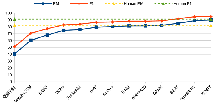 ▲ 图2. SQuAD排行榜上代表性模型性能走势图