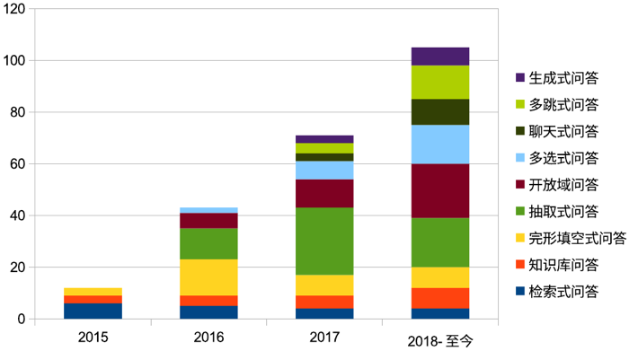 ▲ 图1. 近年来基于深度学习的文本问答学术论文数量随年份变化情况统计(数据统计于ACL、EMNLP、NAACL、NIPS、AAAI等各大顶级学术会议)