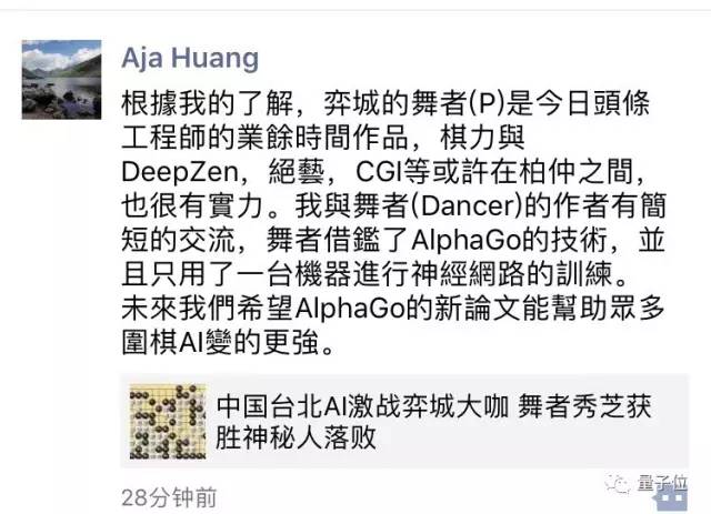 给出谜底的是AlphaGo团队的核心成员黄士杰(Aja Huang)博士。黄士杰博士透露的信息显示:舞者(P)的棋力和DeepZen(地震狗)、腾讯绝艺、CGI(B)等在伯仲之间,而且也借鉴了AlphaGo的技术。