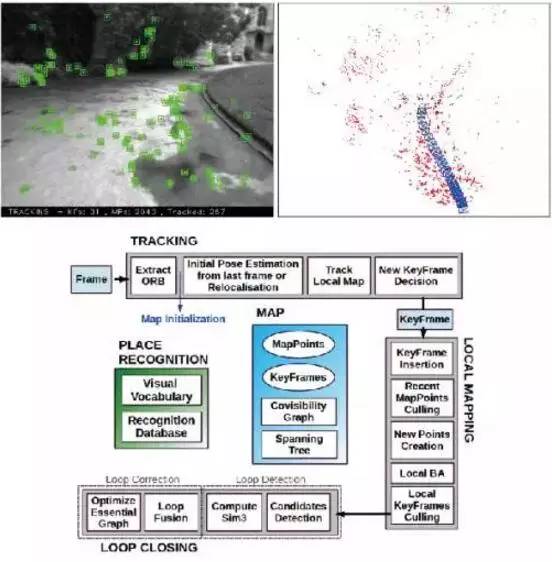 图3 ORB-SLAM运行截图,左侧为图像与追踪到的特征点,右侧为相机轨迹与建模的特征点地图,下方为其标志性的三线程结构