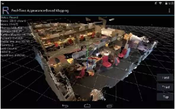 RTAB-MAP(Real Time Appearance-Based Mapping)是RGB-D SLAM中比较经典的一个方案。它实现了RGB-D SLAM中所有应该有的东西:基于特征的视觉里程计、基于词袋的回环检测、后端的位姿图优化,以及点云和三角网格地图。因此,RTAB-MAP给出了一套完整的(但有些庞大的)RGB-D SLAM方案。目前我们已经可以直接从ROS中获得其二进制程序,此外,在Google Project Tango上也可以获取其App使用(如图6所示)。
