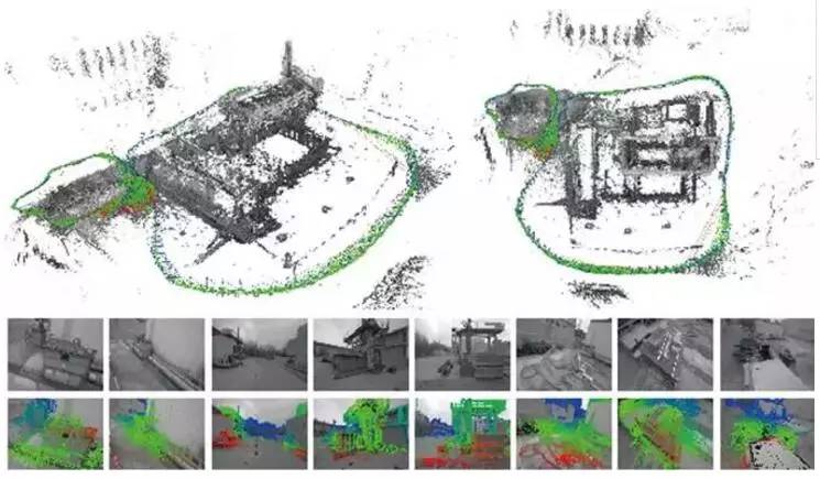 图4 LSD-SLAM运行图片,上半部分为估计的轨迹与地图,下半部分为图像中被建模的部分,即具有较好的像素梯度的部分