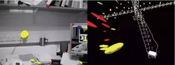 图1 MonoSLAM的运行时截图,左侧:追踪特征点在图像中的表示,右侧:特征点在三维空间中的表示