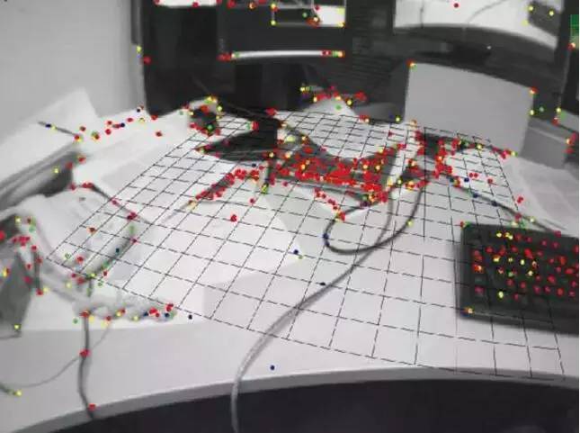 图2 PTAM的演示截图,它既可以提供实时的定位和建图,也可以在虚拟平面上叠加虚拟物体