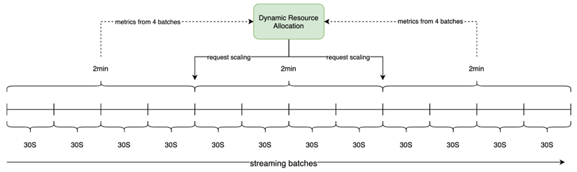 假设当前 Spark Streaming 应用的 BatchDuration 是 30 秒,配置的周期性调度的时间是 2 分钟,那么每次调度时,我们可以拿到过去 4 个 Batch 的处理情况并计算出处理延迟的平均值,前边提到的 Ratio 值的算法就是用平均处理延迟除以 Batch 时间得到,如下图所示。假设过去 4 个 Batch 的平均处理延迟是 20 秒,我们可以估算出目前应用的处理能力大约还有三分之一的弹性空间。我们可以设置弹性伸缩相关的阈值 Scale Up 和 ScaleDown,那么当 Ratio 的值大于 Scale Up 阈值,应用会向 Spark 的 Cluster Manager 发送请求申请新增 Executor,当小于 Scale Down 阈值时,应用会从当前 Executor 中选择不包含 Receiver 的 Executor 并从中随机选取一个,然后发送请求杀死该 Executor。同样的,可以定义 Executor 数量的最大最小值。以上就是原生 Spark Streaming Dynamic Resource Allocation 的基本原理。需要注意的是,新增 Executor 时,需要保证运行应用的资源池资源足够,例如假设应用运行在 Yarn 上,此时需要保证应用所在的队列资源足够。