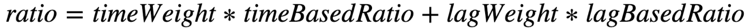 SOS DynamicResource Allocation(简称 SOS DRA)在继承原生特性的基础上,有几点定制化的实现。首先思考一个场景,假设 SOS 应用拉取 Kafka 数据的能力已接近瓶颈,基于当前的计算资源算出的平均处理延迟会趋于一个恒定值,假如此时数据生产的速度大于处理速度,那么整体来讲,SOS 消费数据的 Lag 仍在不断增长。因此,对于前文提到的 Ratio 值的计算,我们引入当前应用的消费 Lag,结合平均处理延迟来加权计算 Ratio。Ratio 的计算逻辑如下边公式所示: