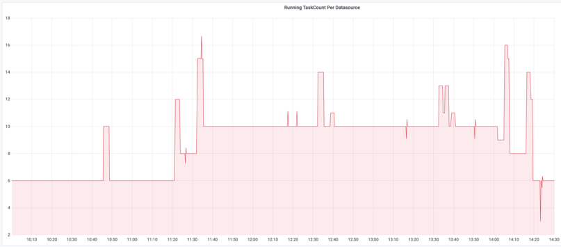 实际运行效果如下图所示,在美国大选期间的某一时间段,突发一流量高峰,从图一中可以看到某 Topic 在大约 11:20-13:20 之间流量从每秒不到 100K 条数据增长到最高值超过每秒 286K 条。图二为该 Topic 对应的 Druid 数据摄入的 Task 数量,如图中所示,大约在相同时间段,Task 数量从之前的 6 个自动扩展到 10 个,达到设定的最大值,在流量高峰过去后,自动缩回到之前 6 个的水平,整个过程无需工程师干预。
