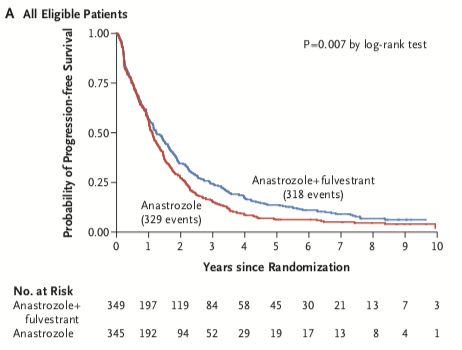 在无疾病进展的患者中,经超过12年的随访,选择性雌激素受体下调剂氟维司群和AI阿那曲唑的组合作为绝经后激素受体阳性转移性乳腺癌患者的一线内分泌治疗,对比阿那曲唑单药,能够显著延长PFS和OS,且前期未经内分泌治疗的患者更应选择氟维司群和阿那曲唑的联合方案。