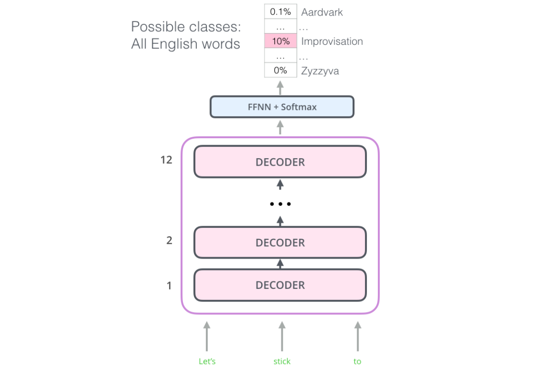 这个模型包括 12 个 Decoder 层。因为在这种设计中没有 Encoder,这些 Decoder 层不会像普通的 Transformer 中的 Decoder 层那样有 Encoder-Decoder Attention 子层。不过,它仍然会有 Self Attention 层(这些层使用了 mask,因此不会看到句子后来的 token)。