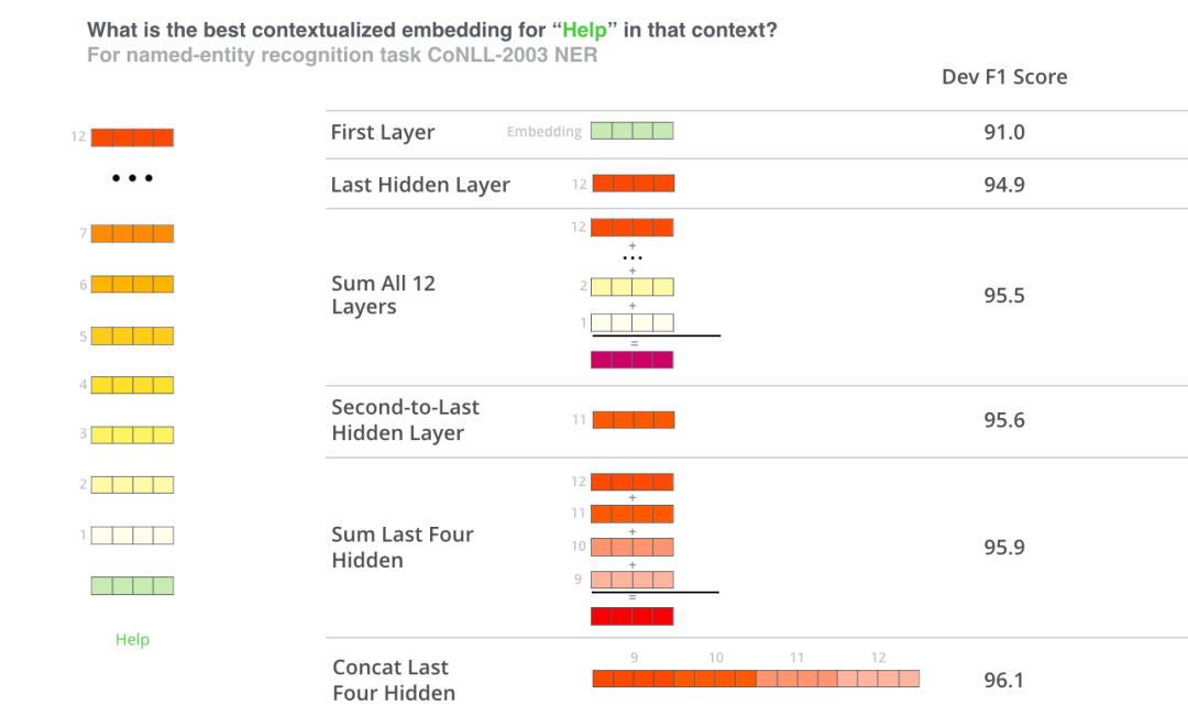 使用 BERT 并不是只有微调这一种方法。就像 ELMo 一样,你可以使用预训练的 BERT 来创建语境化的词嵌入。然后你可以把这些词嵌入用到你现有的模型中。论文里也提到,这种方法在命名实体识别任务中的效果,接近于微调 BERT 模型的效果。