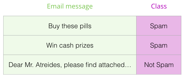 由于我们在讨论分类器,这属于机器学习的监督学习领域。这意味着我们需要一个带有标签的数据集来训练这样一个模型。例如,在下面这个垃圾邮件分类器的例子中,带有标签的数据集包括一个邮件内容列表和对应的标签(每个邮件是“垃圾邮件”或者“非垃圾邮件”)。