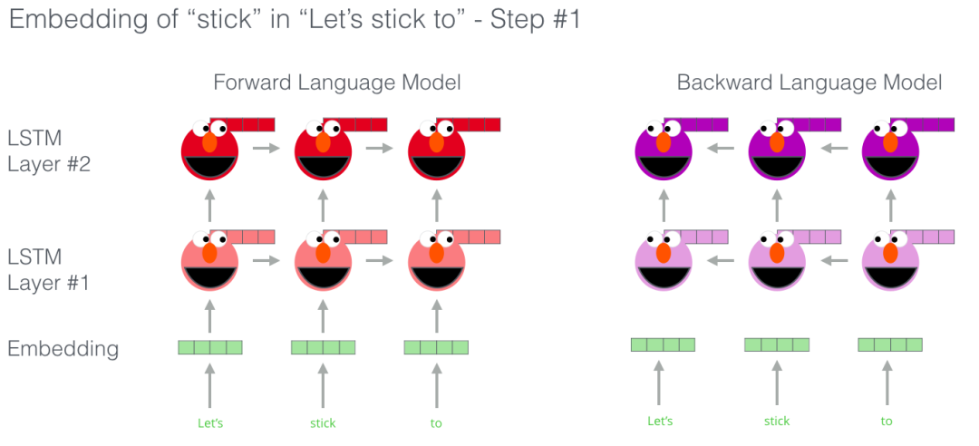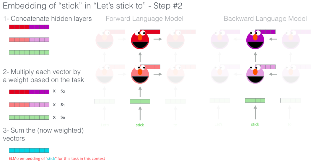在上图中,我们可以看到 ELMo 头部上方展示了 LSTM 的每一步的隐藏层状态向量。在这个预训练过程完成后,这些隐藏层状态在词嵌入过程中派上用场。