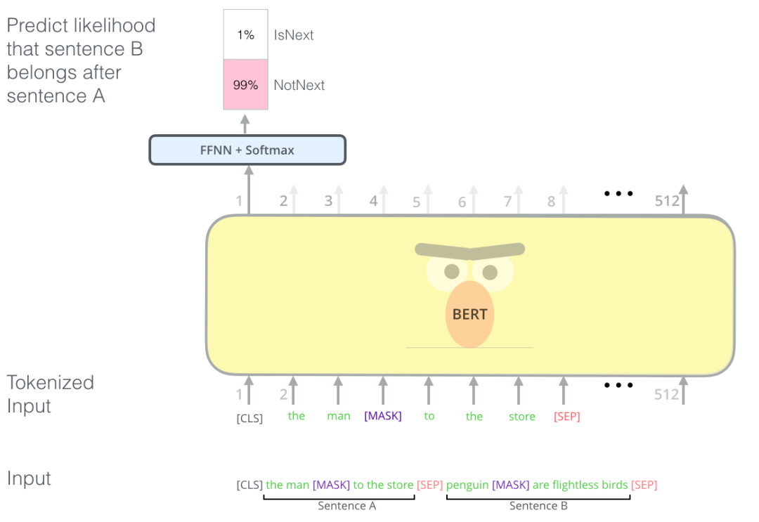 为了让 BERT 更好地处理多个句子之间的关系,预训练过程还包括一个额外的任务:给出两个句子(A 和 B),判断 B 是否是 A 后面的相邻句子。