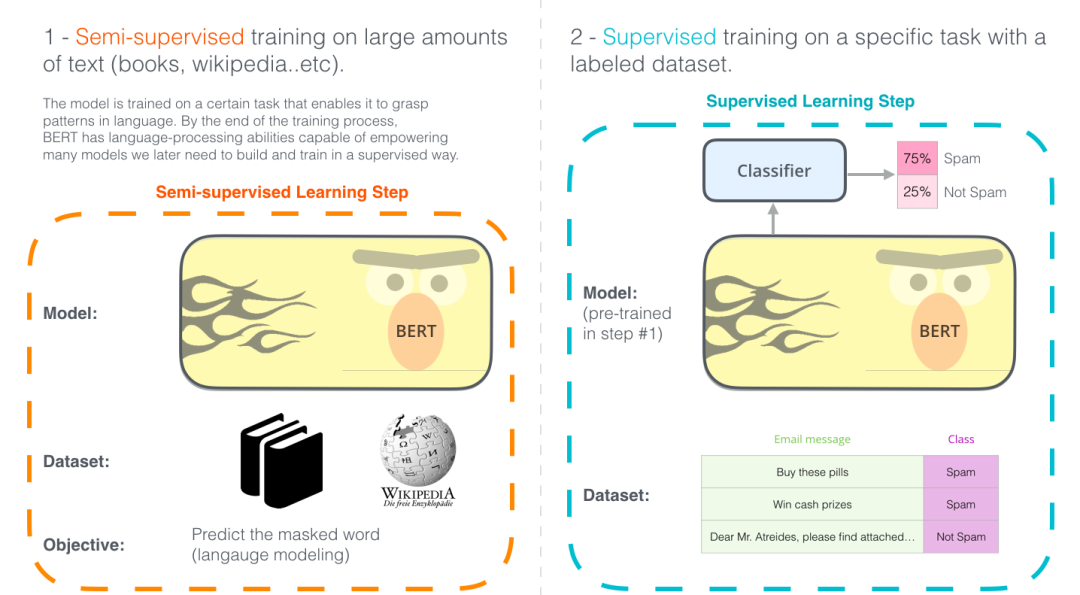 BERT 开发的两个步骤:第 1 步,你可以下载预训练好的模型(这个模型是在无标注的数据上训练的)。然后在第 2 步只需要关心模型微调即可。