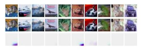 图 3:原始图像(上)、i-ResNet 在 c = 0.9 时的重建结果(中)以及相同架构的标准 ResNet 的重建结果(下)。该图表明固定点迭代在没有 Lipschitz 约束的情况下无法重建输入图像。