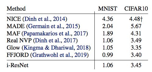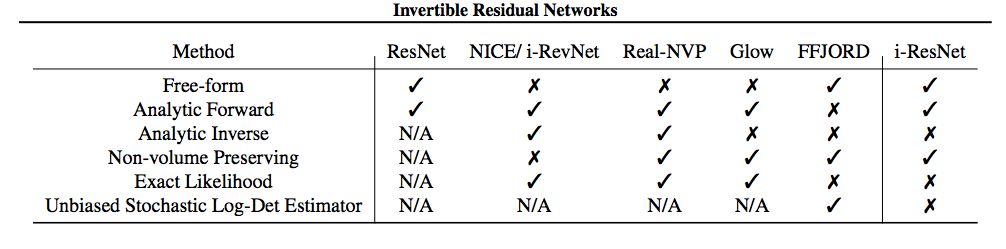 表 1:i-ResNet、ResNet 与 NICE (Dinh et al., 2014)、Real-NVP (Dinh et al., 2017)、Glow (Kingma & Dhariwal, 2018) 及 FFJORD (Grathwohl et al., 2019) 的对比结果。「Non-volume Preserving」指允许收缩和扩张的能力,以及计算变量 (3) 变化的确切似然。「Unbiased Estimator」是指对数行列式的随机近似。