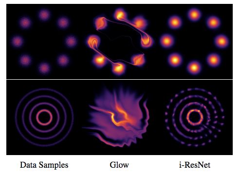图 2:i-ResNet 流和 Glow 的可视化比较。