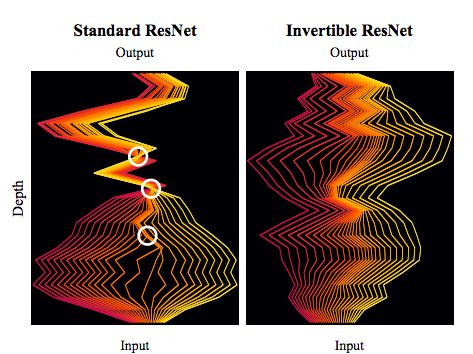 图 1:标准残差网络(左)和可逆残差网络(右)的动态。可逆 ResNet 描述了双射连续动态(bijective continuous dynamics),而常规 ResNet 导致与非双射连续动态相对应的交叉和折叠路径(白色圈)。由于折叠路径,标准 ResNet 不是有效的密度模型。