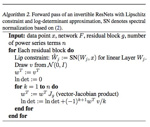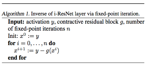 使用 Lip(g) < 1 可使 ResNet 可逆,但我们没有这种可逆的解析形式,不过我们可以通过一个简单的定点迭代来获得,见算法 1。
