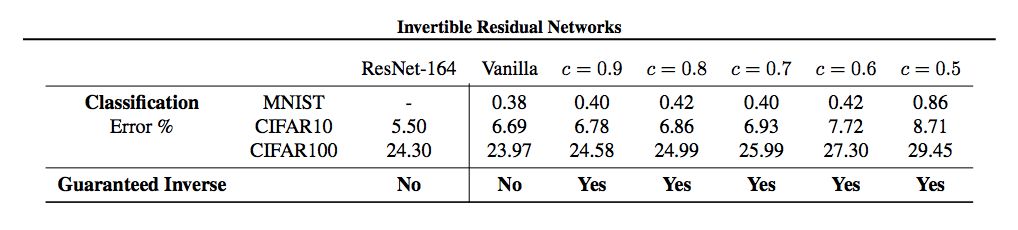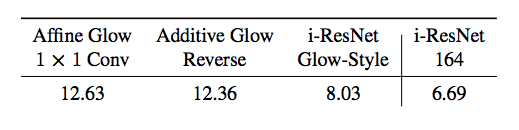 表 3:i-ResNet 与最新技术 Glow 在 CIFAR10 数据集上的分类结果。这里对比了两个版本的 Glow 和与 Glow 层数、通道数都类似的 i-ResNet 架构(i-ResNet, Glow-Style)。