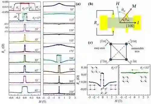 (a) 不同磁场角度下的平面霍尔效应;(b) 转角平面霍尔测量结构示意图;(c)平面磁各向异性示意图。