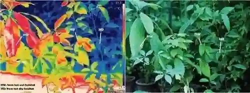 中国科学院西双版纳热带植物园树木年轮与环境变化研究组副研究员林华及其同事以种植在相同环境下的20种元江干热河谷冠层优势植物和18种热带雨林冠层优势植物为研究对象,利用红外热像仪对植物叶片的温度进行研究,并摸索出了“三温法”(叶片温度-无蒸腾叶片温度-参考叶片温度),成功对叶片物理温度效应和蒸腾温度效应进行了原位测量和分离。该研究成果以Stronger cooling effects of transpiration and leaf physical traits of the plants from a hot dry habitat than from a hot wet habitat 为题,发表在Functional Ecology 杂志上。